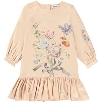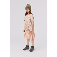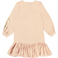 Colette ist ein rosafarbenes Kleid mit Blumendruck auf der Vorderseite und kleinem Rüschenrock unten.