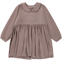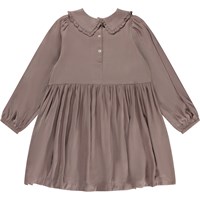 Graubraunes, knielanges Kleid mit langen Ärmeln und "Peter Pan"-Kragen. Dieses Kleid besteht aus 100% weicher Baumwolle, hat einen Rundhalsausschnitt, einen „Peter Pan“-Kragen mit Rüschendetail, einen Knopfverschluss auf der Rückseite, lange Ärmel mit schmalen Bündchen, eine hohe Taille, einen Rock mit viel Volumen und hat eine übergroße Passform.