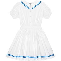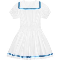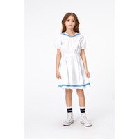 Weißes Kleid im Matrosen-Stil aus Öko-Baumwolle. Das Kleid hat einen Matrosenkragen mit zwei schmalen blauen Streifen am Rand sowie drei Knöpfe vorne. Das Kleid hat kurze Puffärmel mit elastischen Enden. Der Bund ist vorne fixiert und hinten gerafft, sodass er leicht anzuziehen und angenehm zu tragen ist. Der Rand des Rocks hat zwei schmale blaue Streifen, die zum Kragen passen, er rafft sich im Taillenbereich und verleiht dem Kleid Volumen.