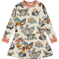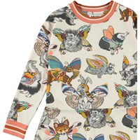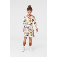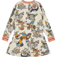 Conny ist ein leichtes Kleid mit einem Aufdruck der Waldtiere mit Flügeln. Sehe, ob Du die Tiere erkennen kannst, obwohl sie Flügel haben? Das Kleid hat lange Ärmel und eine gestreifte Rippkante am Hals und am Ärmelende.
