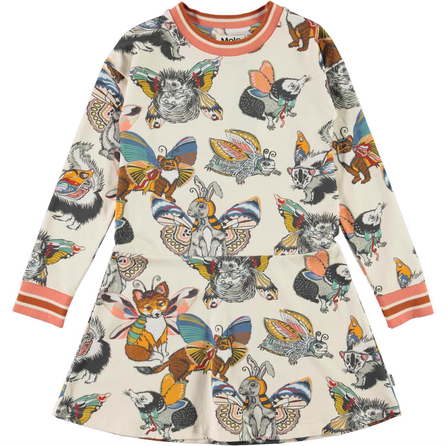 Conny ist ein leichtes Kleid mit einem Aufdruck der Waldtiere mit Flügeln. Sehe, ob Du die Tiere erkennen kannst, obwohl sie Flügel haben? Das Kleid hat lange Ärmel und eine gestreifte Rippkante am Hals und am Ärmelende.