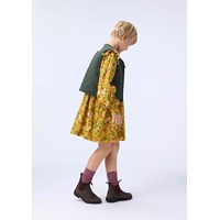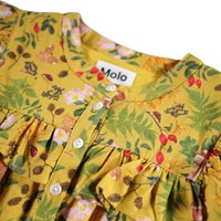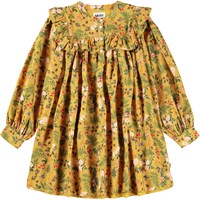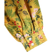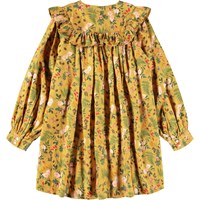 Langärmliges gelbes Kleid aus weicher Viskose, das einen schönen Fall hat. Das Kleid hat einen runden Ausschnitt mit kleinen Knöpfen vorne, lange Ärmel mit Volumen, Rüschen-Details an der Schulter und eine Passe. Es hat eine lockere Passform und ein Allover-Muster aus Blättern, Nüssen und Blumen.