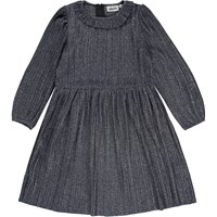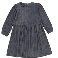 Dunkelblaues knielanges Kleid mit Glitzer und Falten. Dieses Kleid besteht aus einer Polyamidmischung, die die schönen kleinen Falten ermöglicht, die überall im Kleid zu sehen sind. Es hat einen Rundhalsausschnitt mit Faltenkragen, einen verdeckten Reißverschluss auf der Rückseite, eine elastische Taille, lange Ärmel und einen voluminösen Rock und eine reguläre Passform.