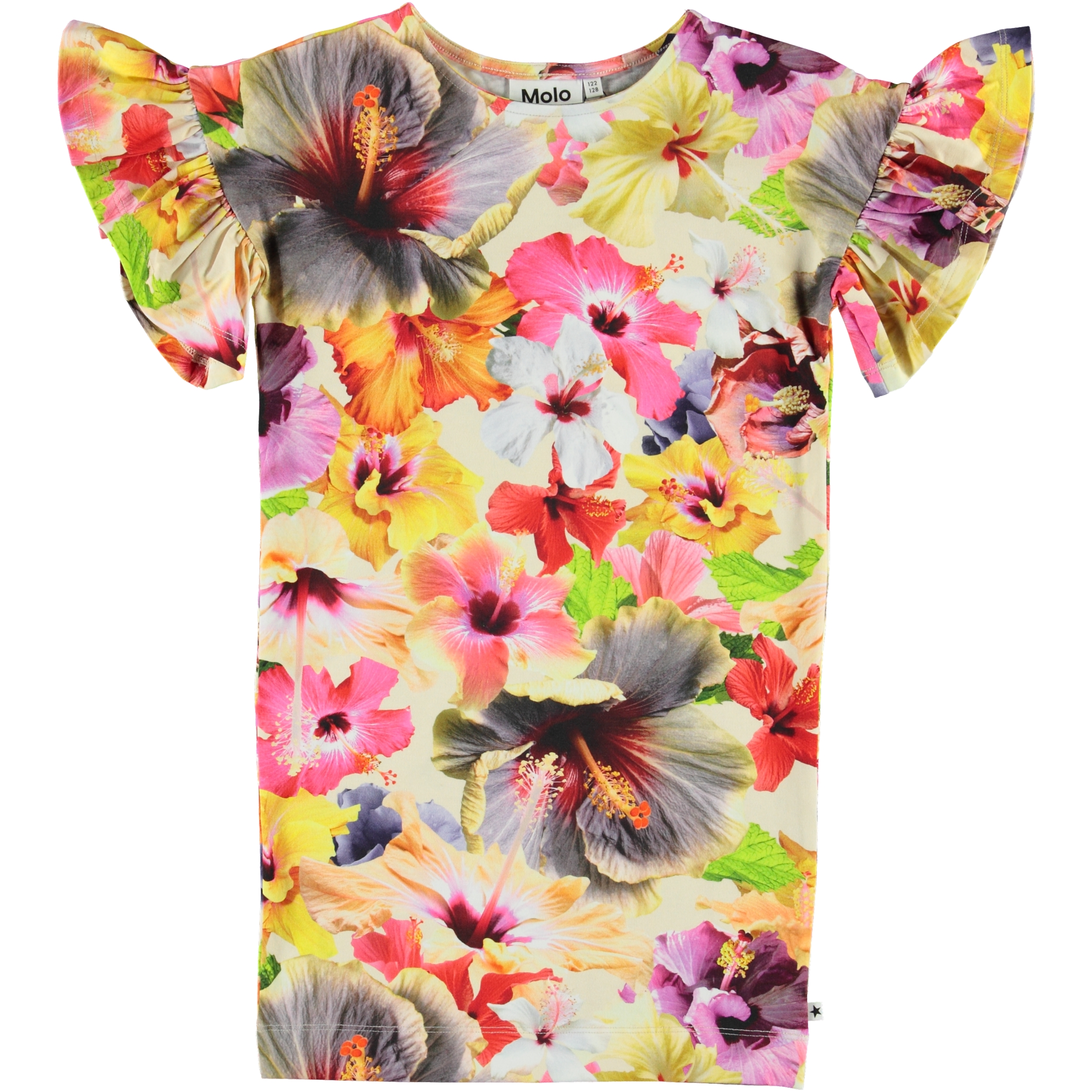 Die Blumen erscheinen hier in wunderschönen Farben im Aufdruck 'Pacific Floral' auf dem Coralie-Kleid. Das Kleid hat Rüschenärmel und einen runden Ausschnitt.