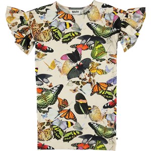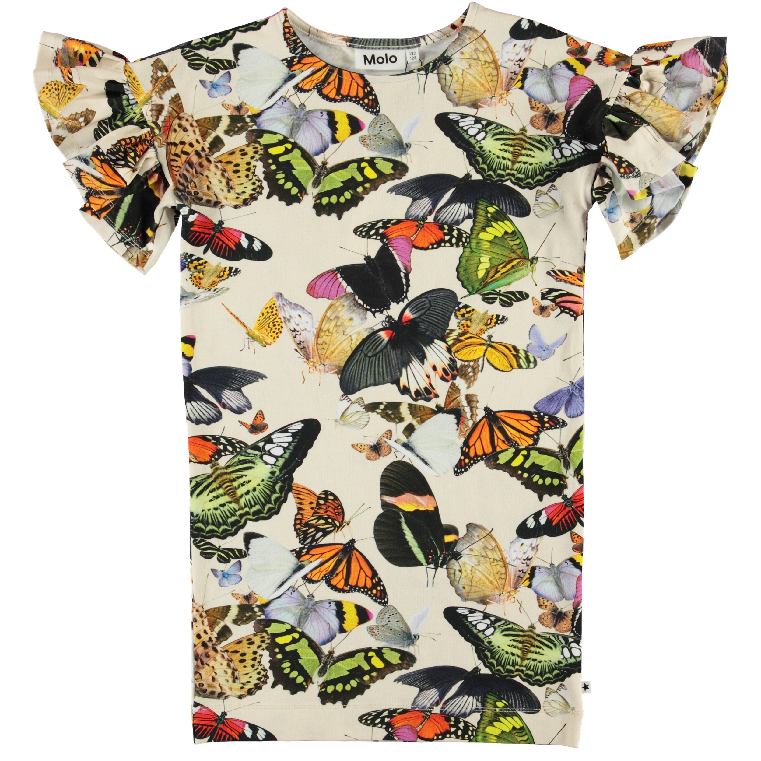 Werde Teil der wunderschönen Schmetterlingsherde mit Coralie-Kleid. Das Kleid hat Rüschenärmel und einen runden Ausschnitt.