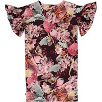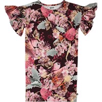 Coralie ist ein Kurzarmkleid mit Blumen-Druck in Burgunderrot- und Rosatönen. Das Kleid hat Rüschenärmel und einen runden Halsausschnitt.