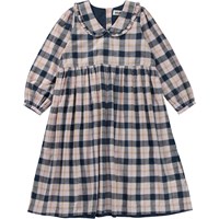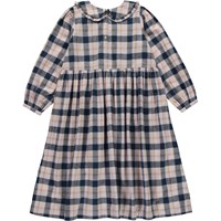 Rosafarbenes Midikleid mit blauen und gelben Karos. Dieses Kleid besteht aus 100% weicher Viskose, hat einen Rundhalsausschnitt, einen „Peter Pan“-Kragen mit Rüschendetail, einen Knopfverschluss auf der Rückseite, lange Ärmel mit schmalen Manschetten, eine hohe Taille, einen Rock mit viel Volumen und hat eine übergroße Passform.