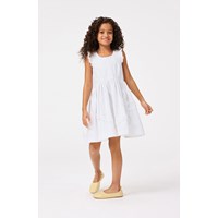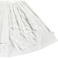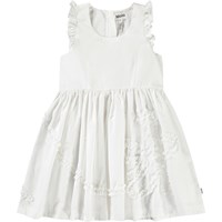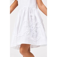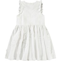 Weißes knielanges Kleid aus Öko-Baumwolle mit Stoffstickerei am Rock. Das Kleid hat eine normale Passform, einen runden Ausschnitt, einen Volant an den Ärmeln und einen unsichtbaren Reißverschluss auf der Rückseite.