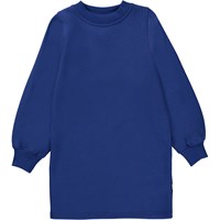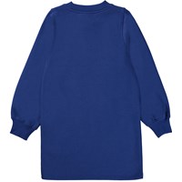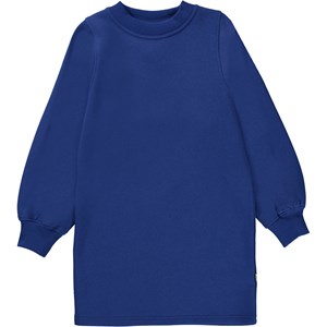 Blaues, knielanges Sweatkleid. Dieses Kleid hat einen Rundhalsausschnitt, Rippbündchen an Hals und Ärmeln und eine normale Passform.