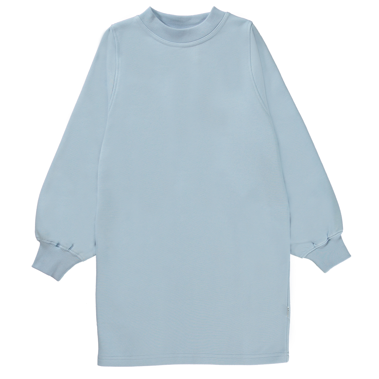 Corvina ist ein hellblaues Sweatshirtkleid, das bis zum Knie reicht. Das Kleid hat eine lockere Passform und ist an Hals und Handgelenken gerippt.Dieses