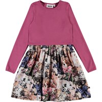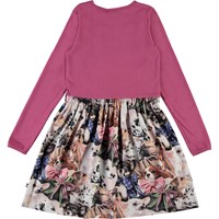 Casie ist ein Kleid mit fuchsia-farbigesen Oberteil in Ripp mit langen Ärmeln und einem femininen Rock mit Druck von kleinen Hunden mit Schleifen um den Hals. Ecocert Greenlife, certifikationsnr. 197496