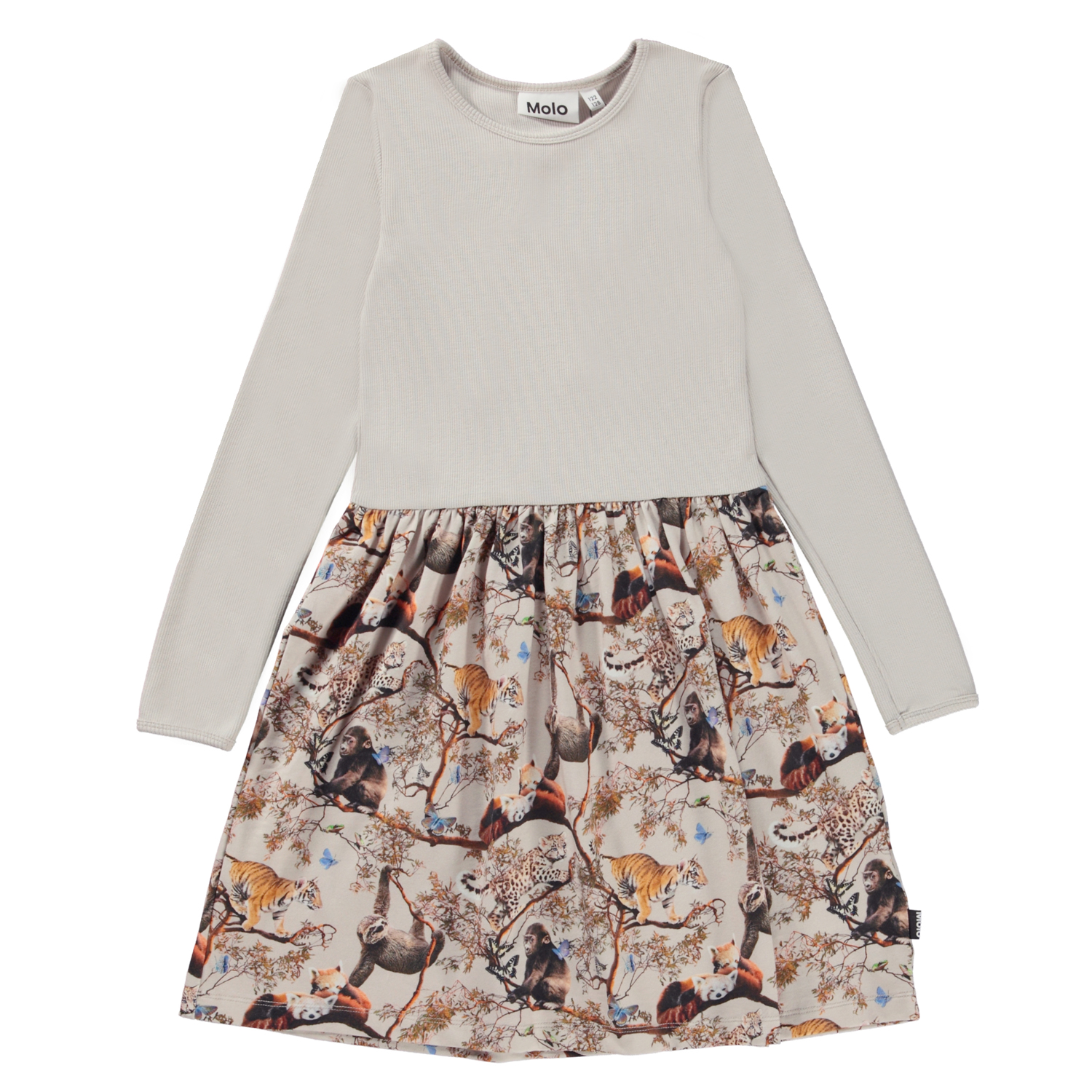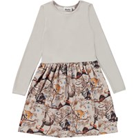 Casie ist ein langärmliges Jerseykleid aus Öko-Baumwolle. Das Oberteil des Kleides ist in Hellgrau gehalten, während der Rock den Allover-Print Cubs Harmony trägt, auf dem verschiedene Tierbabys friedlich und harmonisch zusammenleben.