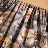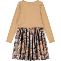 Braunes Langarmkleid aus Öko-Baumwolle, das ein eng anliegendes Oberteil aus geripptem Jersey mit einem glatten Jerseyrock kombiniert. Das Kleid ist leicht anzuziehen und bietet viel Platz zum Spielen und Bewegen. Der Rock hat einen Aufdruck von niedlichen Tieren.