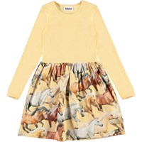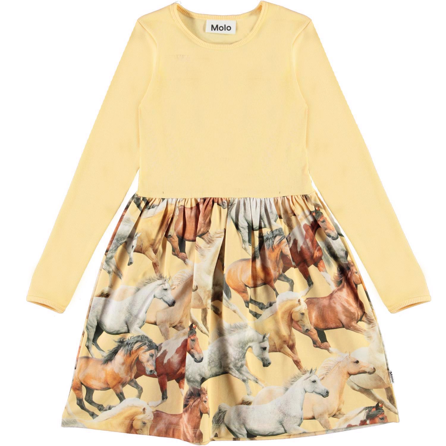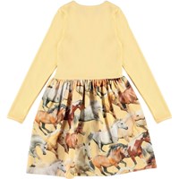 Credence ist ein Kleid mit einem gelben Ripptop mit langen Ärmeln und einem Rock mit Pferdemuster.