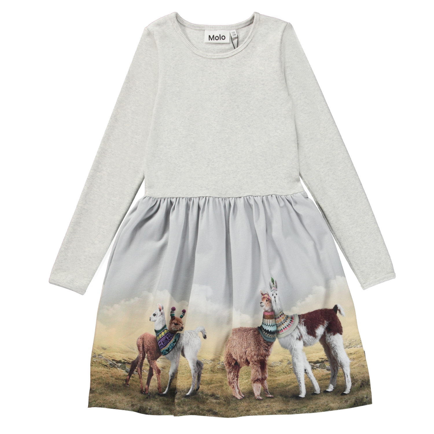 Hellgraues knielanges Kleid mit langen Ärmeln und Lama-Aufdruck Der Aufdruck besteht aus niedlichen und lustigen Lamas voller Humor. Sie tragen Molos eigene Strickmodelle und haben sich gut in Mützen, Halswärmer und Pullover eingehüllt. Dieses Kleid ist aus 100% Baumwolle, hat einen Rundhalsausschnitt, lange Ärmel, einen angenähten Rock mit Aufdruck und eine normale Passform.