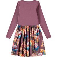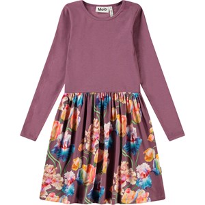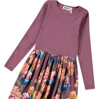 Lila langärmeliges Kleid aus Öko-Baumwolle, das ein eng anliegendes Oberteil aus geripptem Jersey mit einem glatten Jerseyrock kombiniert. Das Kleid ist einfach anzuziehen und bietet viel Platz zum Spielen und Bewegen. Der Rock des Kleides zeigt ein Allover-Print von künstlerischen Tulpen in schönen Farben.