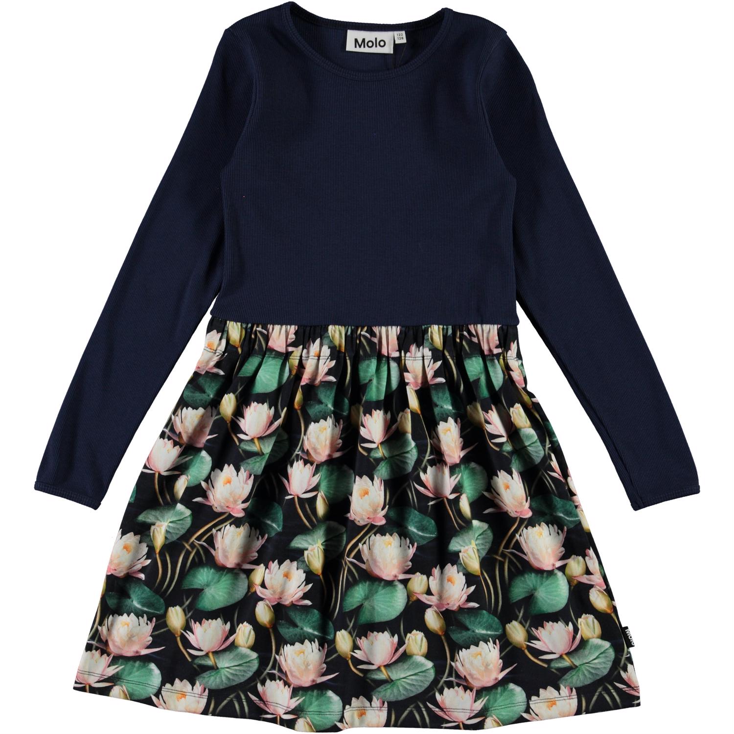 Credence ist ein zweiteiliges Kleid mit langen Ärmeln und einem gerippten Oberteil in Dunkelblau. Der Rock des Kleides ist mit einem Druck von rosa Seerosen.