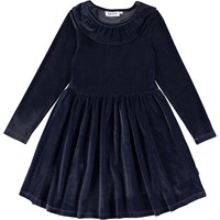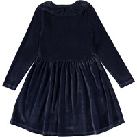 Dunkelblaues Velourskleid mit langen Ärmeln und Rüschenkragen.