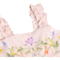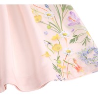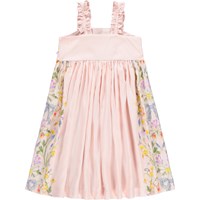 Rosa knielanges Kleid mit Blumenmuster aus weicher Viskose, das sich leicht und luftig auf der Haut anfühlt. Das Kleid hat eine lockere Passform mit breiten Rüschenträgern und einem verdeckten seitlichen Reißverschluss, der das An- und Ausziehen erleichtert und für eine gute Passform sorgt.