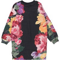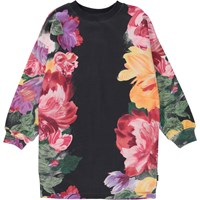 Schwarzes Sweatshirtkleid mit Placement-Blumendruck. Der Druck besteht aus wunderschönen, handgemalten Blumen und wenn Du genau hinsiehst, kannst Du Pinselstriche erkennen. Dieser Druck ist etwas Besonderes, da es Molos eigene und neue Version eines Drucks ist, der in einer Seidenspinnerei in Lyon in Frankreich hergestellt wurde. Ein Ort, der mit all den großen Namen gearbeitet hat, wie z.B. Givenchy, Balenciaga, Chanel, Dior und jetzt auch Molo Kids. Dieses Kleid besteht aus 100% Baumwolle, hat einen Rundhalsausschnitt mit Rippbündchen, lange Ärmel mit Rippbündchen und eine lockere Passform.