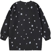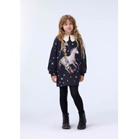 Langärmeliges schwarzes Sweatshirt-Kleid aus Öko-Baumwolle. Das Kleid hat gerippte Kanten am Hals und an den Ärmeln. Auf dem Kleid ist ein Druck von einem Einhorn und Blumen.