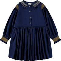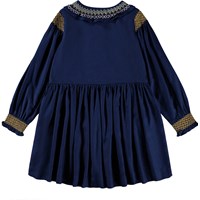 Langärmliges Kleid aus dunkelblauer Viskose mit farbenfrohen Smok-Details am Kragen, an den Schultern und an den Ärmelkanten. Das Kleid hat einen Knopfverschluss vorne und einen gerafften Rock, der dem Kleid Volumen und Lebendigkeit verleiht.