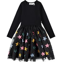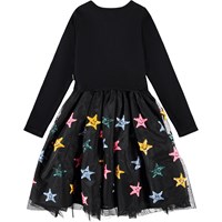Schwarzes langärmeliges Kleid mit passendem Tüllrock mit Paillettensternen. Das Oberteil ist eng anliegend aus geripptem Baumwolljersey mit Rundhalsausschnitt und der Rock reicht bis zum Knie und hat einen schwarzen Unterrock.