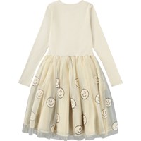 Off-weißes Kleid mit langen Ärmeln und einem Tüllrock mit fröhlichen Pailletten-Gesichtern. Das Oberteil hat eine enge Passform und besteht aus weichem, geripptem Baumwolljersey mit rundem Halsausschnitt. Der Rock ist knielang und mit einem bequemen Baumwollunterrock für zusätzlichen Komfort gefüttert.