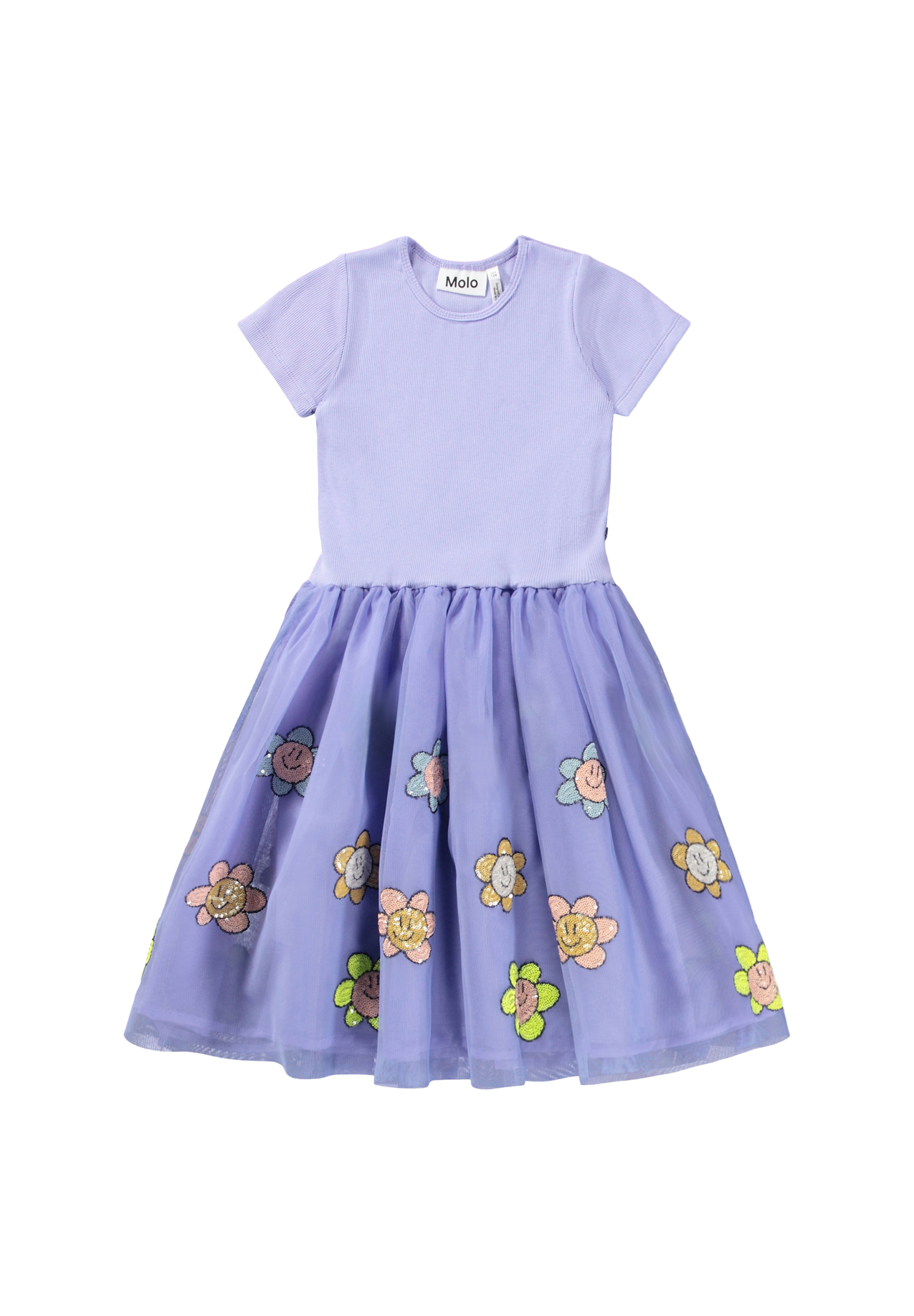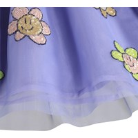 Lila Kleid mit kurzen Ärmeln und einem Tüllrock mit fröhlichen Paillettenblumen. Das Oberteil ist eng anliegend und aus weichem, geripptem Baumwolljersey mit rundem Halsausschnitt gefertigt. Der Rock ist knielang und mit einem bequemen Baumwollunterrock für zusätzlichen Komfort gefüttert.