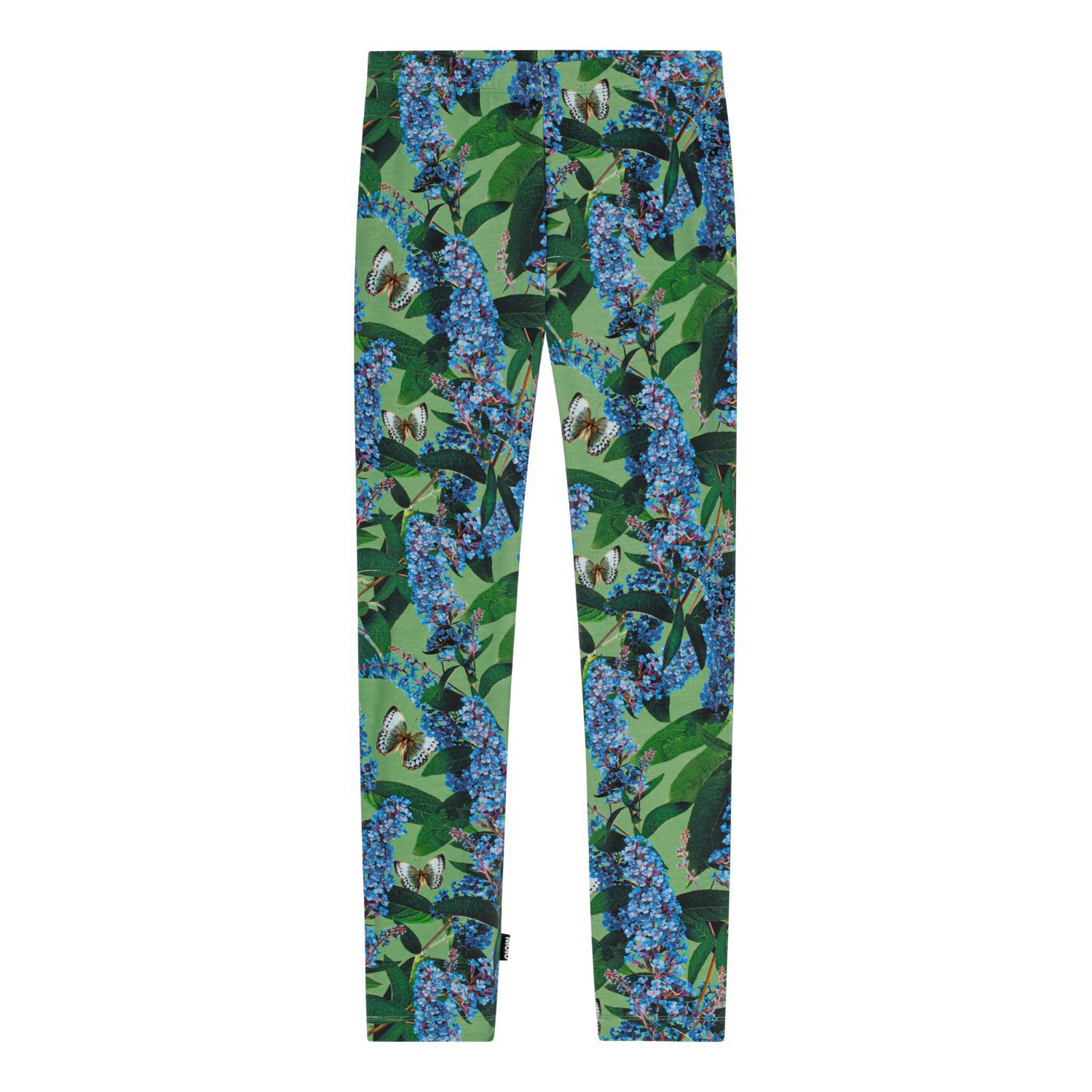 Grüne Leggings aus Öko-Baumwolle mit einer engen Passform und einem elastischen Bund für Komfort und einfaches Anziehen. Der Druck ist ein Allover-Druck von blau-lila Schmetterlingsbüschen mit lebendigen fliegenden Schmetterlingen. Leggings eignen sich perfekt zum Stylen unter Kleidern, Röcken und übergroßen Pullovern für einen bequemen und trendigen Look.