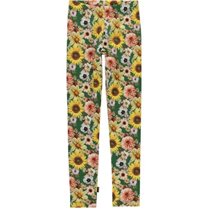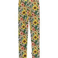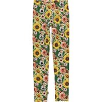 Grüne Leggings mit Allover-Blumendruck. Der Druck besteht aus vielen verschiedenen Blumen, wie Sonnenblumen und Dahlien, in Rosa- und Gelbtönen. Diese Leggins sind aus 100% Baumwolle, haben einen elastischen Bund und eine schmale Passform.