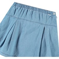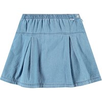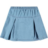 Blauer tennisinspirierter Rock aus Öko-Baumwoll-Chambray. Der Rock verfügt über einen elastischen Bund, eine schöne Knopfleiste an der Seite, ein Futter und einen vollen, kreisförmigen Rock für ein schönes Volumen.