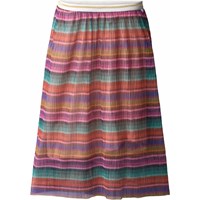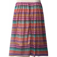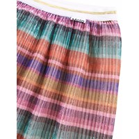 Bunt gestreifter Plissee-Rock. Der Rock hat einen elastischen Bund, sodass er hoch in der Taille oder auf der Hüfte getragen werden kann. Der Rock reicht bis zur Mitte des Schienbeins und fällt wunderschön.