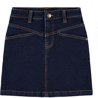 Jeansrock in Dunkelblau mit kupferfarbenen Nähten. Schöne Nähte vorne, zwei Seitentaschen und Gürtelschlaufen.