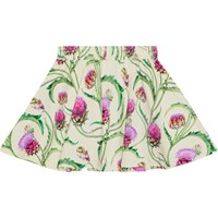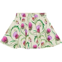 Rock aus Öko-Baumwolle. Der Rock hat einen elastischen Bund und einen abgerundeten Rock. Der Druck ist ein Allover-Druck aus lila und rosa Artischockenblüten mit einem pastellgelben Hintergrund.