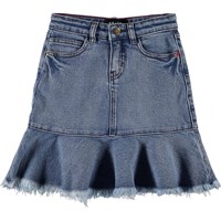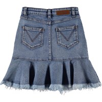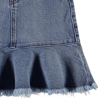 Barbro ist ein blauer Jeansrock mit Gürtelriemen sowie Taschen vorne und hinten. Der Rock hat unten eine rohe, abgeschnittene Kante.