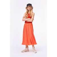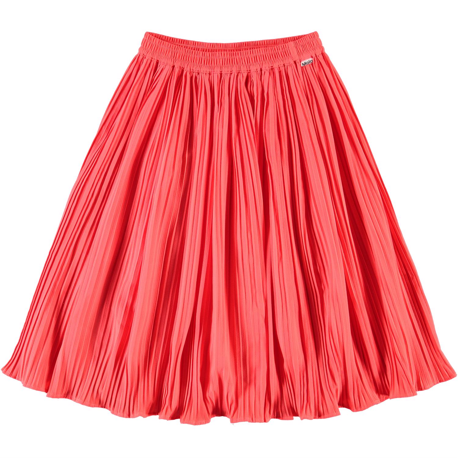 Becky ist ein plissierter Rock in Korallenrot- Neon mit elastischer Taille. Der Rock ist leicht und luftig und fällt schön.