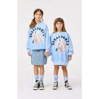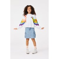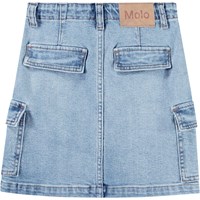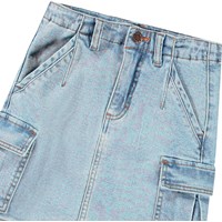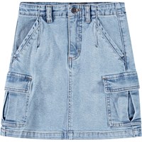 Hellblaue Jeansrock aus Öko-Baumwolle. Der Rock ist knielang, hat eine reguläre Passform und der Bund ist mit Gürtelschlaufen, Knopf- und Reißverschluss sowie einem internen Gummizug ausgestattet, der für die richtige Passform bei allen Kindern sorgt. Der Rock hat Vorder- und Gesäßtaschen sowie große Cargotaschen an den Seiten.
