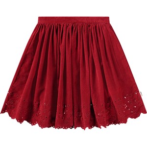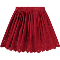 Dunkelroter Minirock aus Öko-Baumwolle mit einem eleganten Spitzenmuster kleiner Blumen am unteren Saum des Rocks. Der Rock ist knielang, einfach anzuziehen und dank des elastischen Bundes angenehm zu tragen.