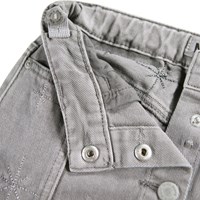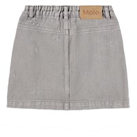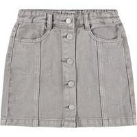 Grauer Baumwoll-Twillrock mit Knopfverschluss und silberner Stickerei. Der Rock reicht bis zur Mitte des Oberschenkels und hat eine Taille mit Gürtelschlaufen und Vordertaschen. Der schöne Schnitt umfasst detaillierte Nähte, die von den Taschen nach unten verlaufen. Kombinieren Sie ihn mit der passenden Jacke für einen vollständigen Look.