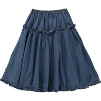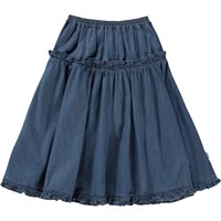 Dunkelblauer Midirock im Denim-Look. Dieser Rock besteht aus 100% Baumwollchambrey, hat ein Oberteil und einen Rock mit Volumen und Rüschendetails. Er hat einen Gummizug in der Taille, sodass er leicht an- und auszuziehen ist, und eine normale Passform.