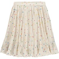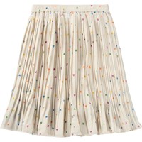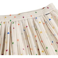 Off-weißer Faltenrock mit einem Druck aus kleinen, bunten Herzen. Der Rock hat einen schweren und schönen Fall, endet knapp über dem Knie und hat einen elastischen Bund, was ihn sowohl bequem zu tragen als auch einfach an- und auszuziehen macht.