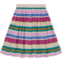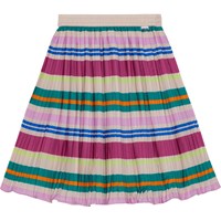 Gestreifter Plisseerock in mehreren Farben, der elegant über das Knie fällt. Der Rock hat einen elastischen Bund, der das An- und Ausziehen erleichtert. Er strahlt eine leichte und sportliche Atmosphäre aus.