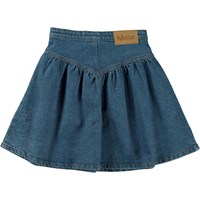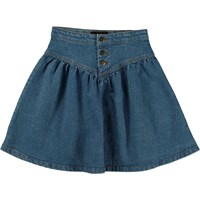 Betsy ist ein mittelblauer, knielanger Jeansrock. Betsy hat vorne eine Passe mit 3 Knöpfen und einen Rock, der gerafft ist, um einen voluminöseren Look zu erzielen.