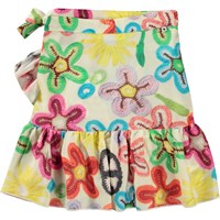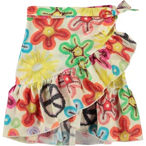 Wickelrock aus 100% Öko-Baumwolle mit Allover-Print aus gehäkelten Blumen und Peace-Zeichen in verschiedenen Farben. Der Rock reicht bis knapp über das Knie und endet mit einer wallenden Rüsche. Es lässt sich leicht in der Taille binden und eignet sich daher ideal zum Tragen über der Badebekleidung auf dem Weg nach Hause vom Pool oder vom Strand.