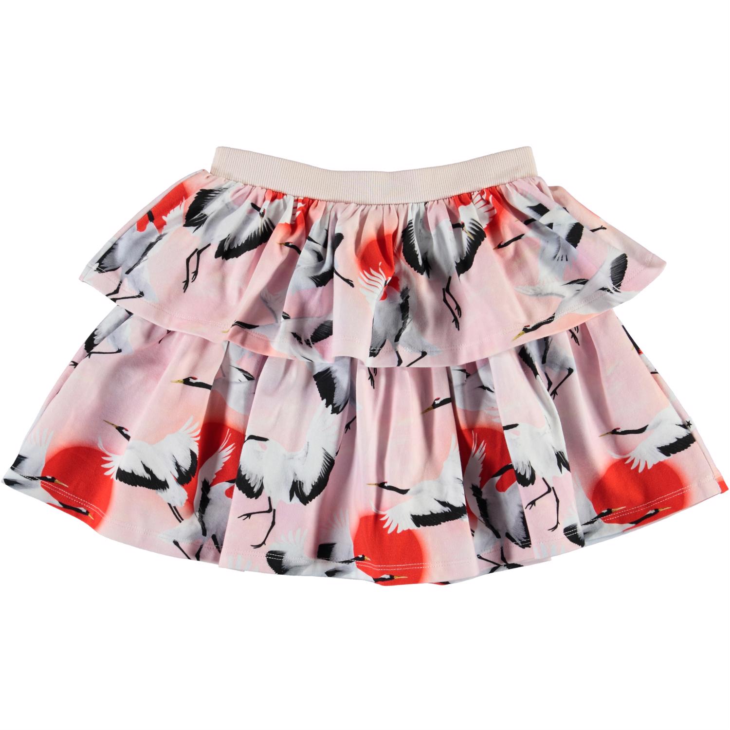 Bini ist ein rosa Rock mit roten Punkten und fliegenden Kranichen. Der Rock hat 2 Schichten und eine elastische Taille.