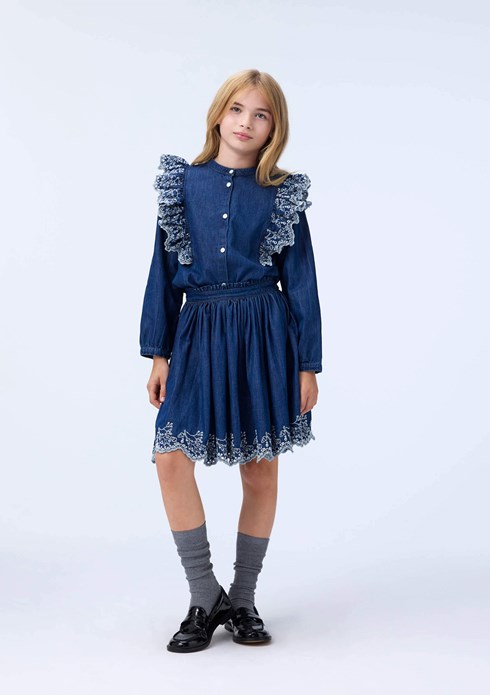Blauer Rock aus Öko-Baumwoll-Chambray mit weißer Broderie Anglaise-Stickerei. Der Rock ist knielang mit einem vorderen festen und hinten elastischen Bund, um das Anziehen zu erleichtern und angenehm zu tragen.