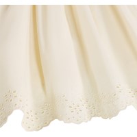Off-weißer Rock aus weichem, ökologischem Baumwollpopeline mit schönen Broderie-Anglaise-Details entlang des Randes. Der Rock ist knielang und hat einen Bund mit einer feinen, kleinen Rüschkante. Er ist vorne fixiert und hinten elastisch, sowie mit einem unsichtbaren Reißverschluss an der Seite, was das Anziehen erleichtert und ihn angenehm zu tragen macht.