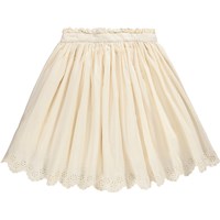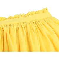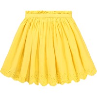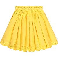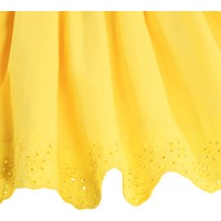 Gelber Rock aus weichem, ökologischem Baumwollpopeline mit schönen Broderie-Anglaise-Details entlang des Randes. Der Rock ist knielang und hat einen Bund mit einer feinen, kleinen Rüschkante. Er ist vorne fixiert und hinten elastisch, sowie mit einem unsichtbaren Reißverschluss an der Seite, was das Anziehen erleichtert und ihn angenehm zu tragen macht.