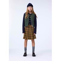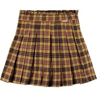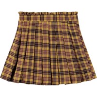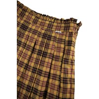 Kurzer gelb-schwarz karierte Rock. Der Rock ist plissiert mit einem Rüschenrand oben und einem unsichtbaren Reißverschluss an der Seite, um das Anziehen zu erleichtern.